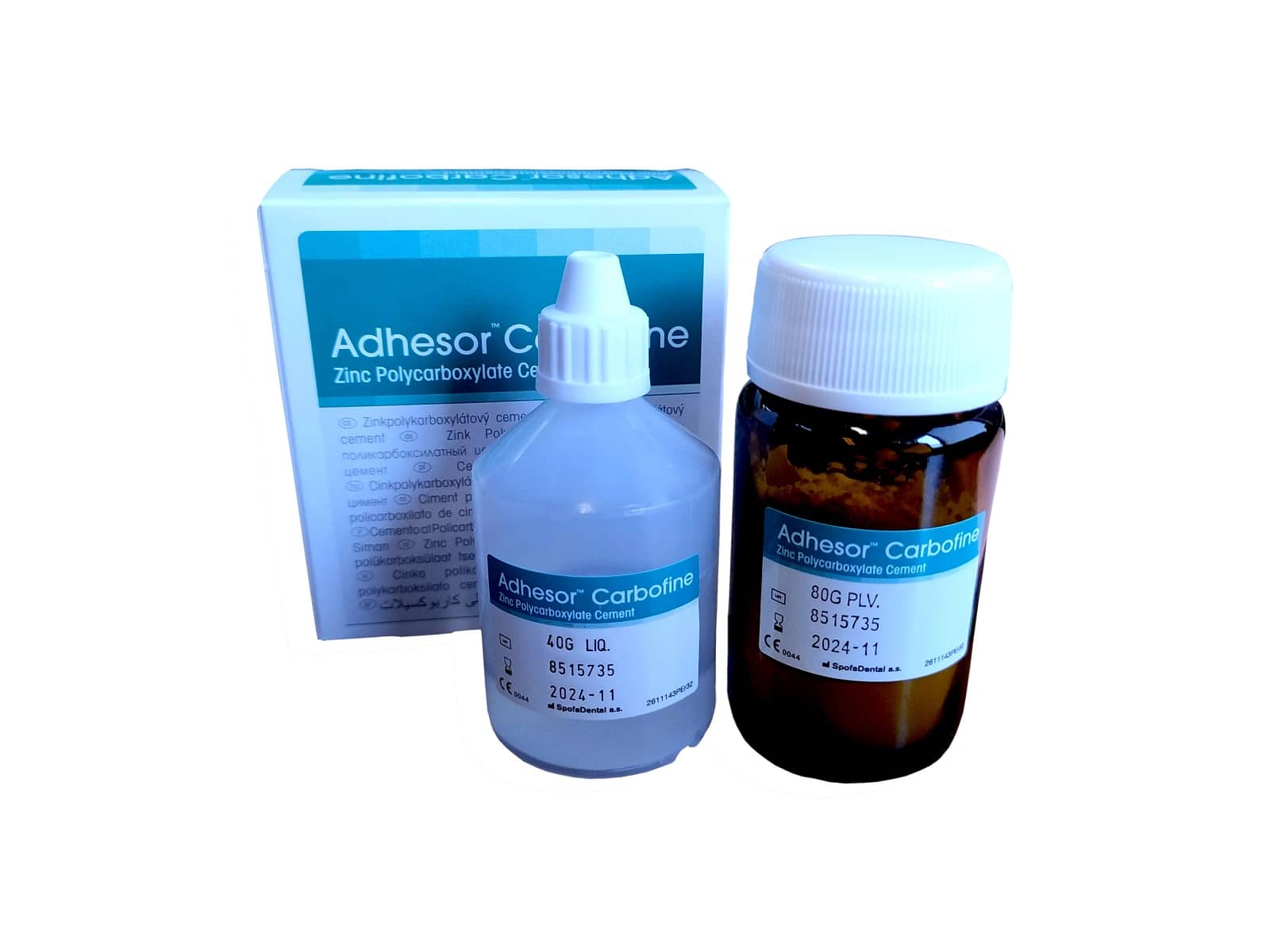 Adhesor Carbofine jest niedrażniącym cementem cynkowo-polikarboksylowym, nie wpływającym negatywnie na miazgę, o naturalnej adhezji do twardej tkanki zęba. Jest widoczny na zdjęciach rentgenowskich. Wskazania: - Zaleca się jego stosowanie do pokrycia zaaplikowanego preparatu Calxyd. - Ponieważ Adhesor Carbofine bardzo dobrze wiąże w środowisku wilgotnym zaleca się stosować go wszędzie tam, gdzie ubytku nie można dokładnie wysuszyć. - Jako wypełnienie tymczasowe o trwałości do 6-ciu miesięcy od zaaplikowania. - Do cementowania mniejszych protez stałych (1 do maksymalnie 2 koron). Opakowanie: - 80 g proszku - 40 g płynu.