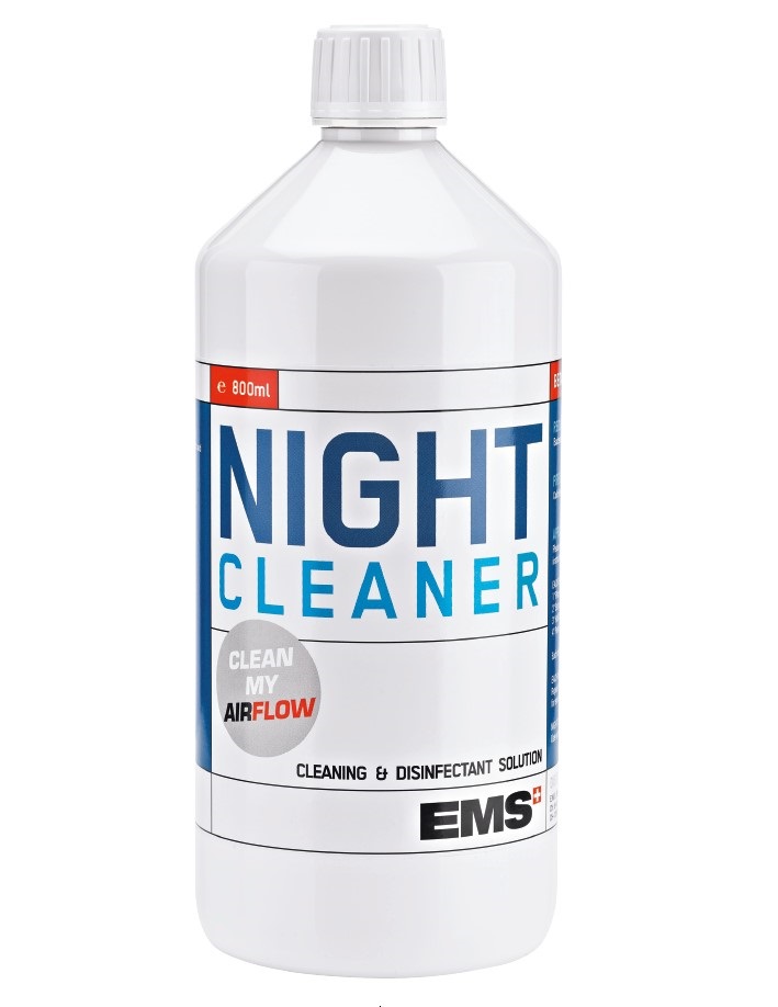 AIR FLOW Night Cleaner 800 ml to profesjonalny płyn przeznaczony do czyszczenia i dezynfekcji przewodów wodnych w systemach profilaktycznych EMS. Produkt stosowany jest w urządzeniach AIRFLOW® Prophylaxis Master oraz AIRFLOW® One pracujących przy unicie stomatologicznym. Preparat przeznaczony do stosowania nocnego wspiera utrzymanie higieny wewnętrznego obiegu wodnego urządzenia. Zalety: Skuteczne czyszczenie i dezynfekcja przewodów wodnych. Wsparcie utrzymania higieny systemów profilaktycznych EMS. Ograniczenie odkładania się biofilmu w instalacji wodnej. Preparat gotowy do użycia – bez konieczności rozcieńczania. Wydajna pojemność umożliwiająca około miesiąca regularnego użytkowania (przy orientacyjnym zużyciu ok. 30 ml na cykl). Cechy: Preparat typu Night Cleaner przeznaczony do pozostawienia w systemie na noc. Dedykowany do systemów AIRFLOW® marki EMS. Roztwór gotowy do użycia. Produkt do profesjonalnego zastosowania w gabinecie stomatologicznym. Opakowanie: butelka 800 ml. Informacje techniczne: Typ produktu: Night Cleaner (płyn do dezynfekcji nocnej). Zastosowanie: czyszczenie i dezynfekcja przewodów wodnych. Kompatybilność: AIRFLOW® Prophylaxis Master, AIRFLOW® One. Pojemność: 800 ml. Orientacyjne zużycie: ok. 30 ml / cykl. Sposób użycia: zgodnie z instrukcją producenta urządzenia.