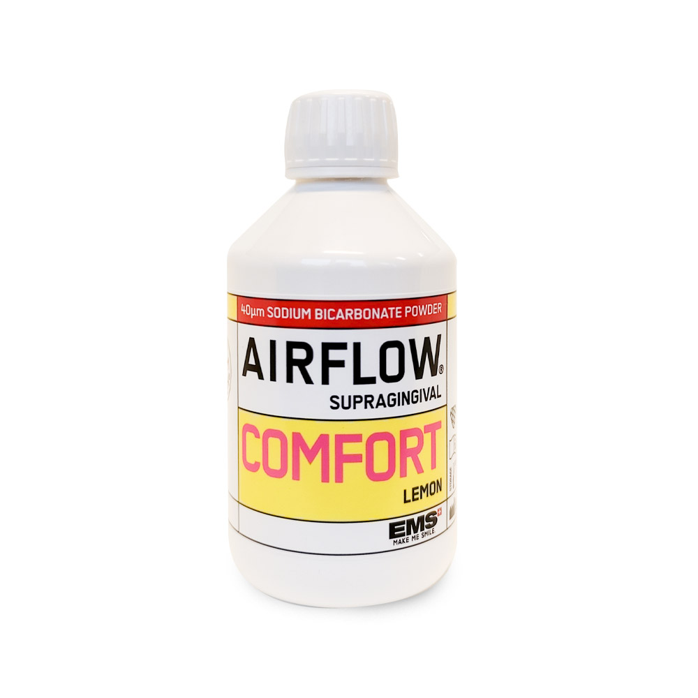 AIR-FLOW® CLASSIC COMFORT -piasek szczególnie polecany dla pacjentów z nadwrażliwością zębów. Dzięki zmniejszonej do 40 µm średnicy ziarenka piasku, jest zdecydowanie bardziej przyjazny i lepiej akceptowalny przez pacjentów. Oferuje dobrze znane efekty pracy dwuwęglanem sodu z optymalnym komfortem dla pacjenta. Nie zapycha dyszy gwarantując optymalne piaskowanie. Przeznaczony jest do profilaktyki naddziąsłowej, w tym do: - przydziąsłowego usuwania biofilmu i przebarwień, - przygotowywania powierzchni zębów do leczenia.. opakowanie: butelka piasku 300g o smaku cytrynowym