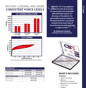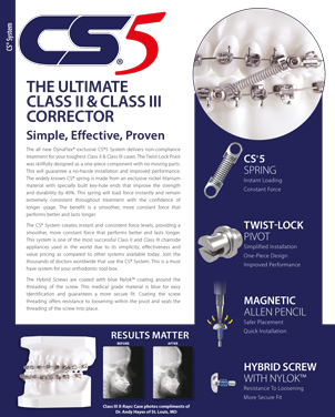 System CS5®- jedyny na rynku korektor zgryzu do klasy II i III w jedynym zestawie. CS5 jest wykonany z ekskluzywnego materiału niklowo-tytanowego ze specjalnie zbudowanymi końcówkami otworami na klucze, które poprawiają wytrzymałość i trwałość o 40%. Sprężyna CS5 tworzy natychmiastowe i spójne poziomy siły, zapewniając płynniejszą, bardziej stałą siłę, która działa lepiej i trwa dłużej. System ten jest jednym z najbardziej udanych urządzeń krzesełkowych klasy II i III stosowanych na świecie ze względu na jego prostotę, skuteczność i cenę w porównaniu z innymi dostępnymi obecnie systemami. Dołącz do tysięcy lekarzy na całym świecie, którzy korzystają z systemu CS®. Jest to niezbędny system do skrzynki narzędzi ortodontycznych. Zestaw zawiera ( dla 5 pacjentów): 10 CS5® Niti Sprężynek/7mm 20 Pivots(Twist Lock) 20 Hybrid Screws 1 Allen Pencil 1 Magnet
