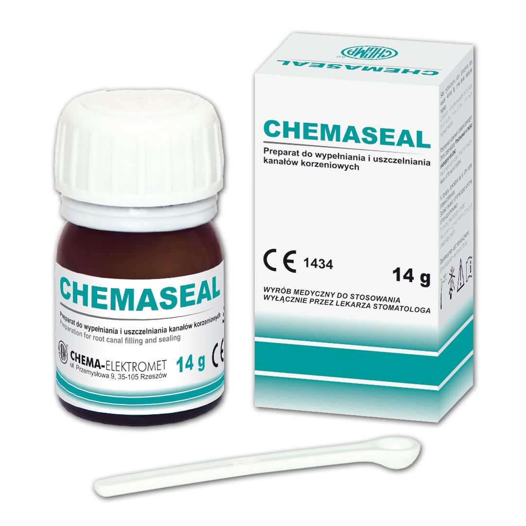 Chemaseal - preparat do ostatecznego wypełniania kanałów oraz uszczelniania kanałów korzeniowych z użyciem ćwieków. Materiał nie resorbuje się i szczelnie wypełnia kanał. Jest bardzo dobrze widoczny w obrazie RTG. Produkowany jest w formie proszku i wymaga zmieszania z Eugenolem w celu uzyskania pasty. Zawiera octan octanu hydrokortyzonu o silnych właściwościach przeciwzapalnych. Dzięki zawartości dijodotymolu wykazuje również właściwości antyseptyczne, które trwają do momentu stwardnienia materiału. Po umieszczeniu pasty w kanale korzeniowym, w ciągu kilku (max. 72) godzin materiał twardnieje tworząc jednorodną stałą masę W zakresie czasu wiązania, grubości warstwy i rozpuszczalności wyrób spełnia wymagania normy PN-EN ISO 6876. Opakowanie: 14g proszku