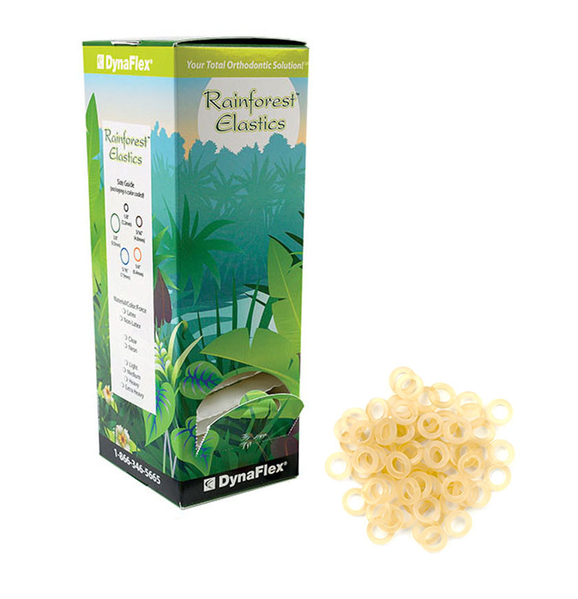 Elastyczne wyciągi ortodontyczne 1/4" (6,4mm) MEDIUM FORCE Butterfly (motyl). Wyciągi amerykańskiej firmy DYNAFLEX są produkowane przy użyciu najwyższej jakości surowca medycznego. Gumki w stylu Rainforest są doskonale uformowane i dokładnie przycięte, aby zapewnić stały poziom siły. - lateksowe, wyprodukowane z żywicy medycznej - nie wchłaniają wody ani śliny - oferują stałe poziomy siły Opakowanie: 100 sztuk.