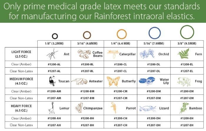 Elastyczne wyciągi ortodontyczne 3/16" (4,8mm) HEAVY FORCE Chimp (szympans). Wyciągi amerykańskiej firmy DYNAFLEX są produkowane przy użyciu najwyższej jakości surowca medycznego. Gumki w stylu Rainforest są doskonale uformowane i dokładnie przycięte, aby zapewnić stały poziom siły. - lateksowe, wyprodukowane z żywicy medycznej - nie wchłaniają wody ani śliny - oferują stałe poziomy siły Opakowanie: 100 sztuk.