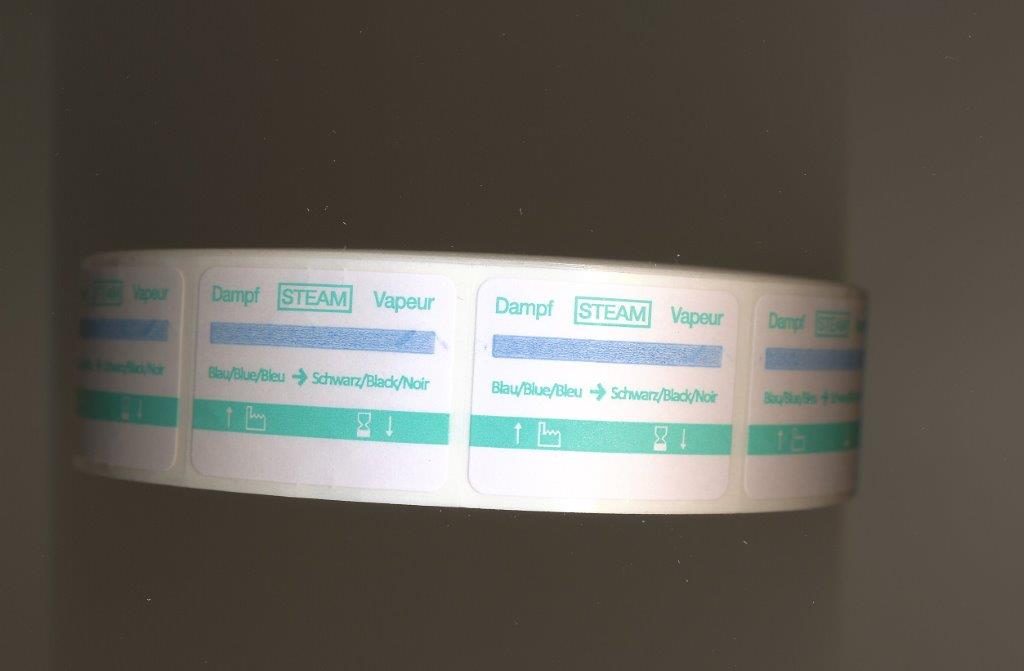 Unikatowe, dwukrotnie przylepne etykiety z nadrukowanym wskaźnikiem typu 1 procesu sterylizacji parowej, Przeznaczone są do oznaczania wszystkich pakietów przeznaczonych do sterylizacji parą wodną. Umożliwiają nadrukowanie istotnych informacji takich jak: 1. data sterylizacji – 8 znaków; 2. data ważności – 8 znaków; 3. nr sterylizatora – 2 znaki; 4. nr cyklu – 4 znaki: np. 4 ostatnie cyfry numeru kolejnego cyklu wyświetlanego przez sterylizator; 5. kod operatora – 2 znaki; 6. symbol pakietu: trzy znaki cyfrowe. Posiadają nadrukowany wskaźnik sterylizacji parowej STEAM typu 1 wg PN EN ISO 11140 -1:2015 Podwójna warstwa przylepna pozwala na wklejenie zadrukowanej etykiety do dokumentacji pacjenta operowanego narzędziami sterylizowanymi w danym pakiecie. Są kompatybilne z metkownicą trzyrzędową drukującą wzdłuż przesuwu taśmy z etykietami. Wskaźnik procesu do sterylizacji parą wodną znajduje się na każdej etykiecie i zmienia zabarwienie z niebieskiego na ciemnobrązowy/czarny. opakowanie: 750 etykiet na rolce. Przechowywać w suchym, ciemnym i chłodnym miejscu.
