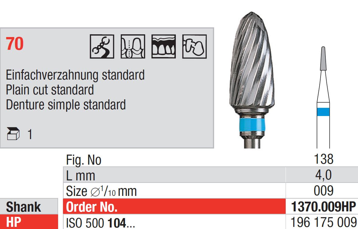 yp narzędzia: frez karbidowy (TC Cutter) – tungsten carbide bur Kluczowe cechy: Materiał: węglik spiekany – bardzo trwały i odporny na ścieranie, idealny do pracy z twardymi materiałami. Przeznaczenie: cięcie i obróbka metalu, akrylu, tworzyw sztucznych, porcelany oraz szkliwa – stosowany w pracach protetycznych i stomatologicznych. Średnica robocza: 0,9 mm – zapewnia wysoką precyzję. Trzpień: HP (Handpiece) – do prostnicy. Użytkowanie: narzędzie wielokrotnego użytku, ekonomiczne i niezawodne. Charakterystyka pracy: szybkie, czyste cięcie, doskonała stabilność podczas pracy, długa żywotność. Frez Edenta 1370.009HP wykonany z węglika spiekanego to narzędzie do zadań specjalnych w protetyce i stomatologii. Zapewnia wyjątkową trwałość i precyzję cięcia, świetnie sprawdza się w obróbce metalu, ceramiki, akrylu i innych twardych materiałów. Dzięki solidnemu wykonaniu i wielokrotnemu zastosowaniu jest niezawodnym wyborem dla profesjonalistów poszukujących narzędzi najwyższej jakości.