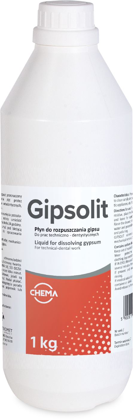 Płyn stosowany w pracach techniczno-dentystycznych. Przeznaczony jest do oczyszczania płyt protez akrylowych, aparatów ortodontycznych, itp. z pozostałości gipsu. Zawiera cytrynian sodu. opakowanie: 1kg