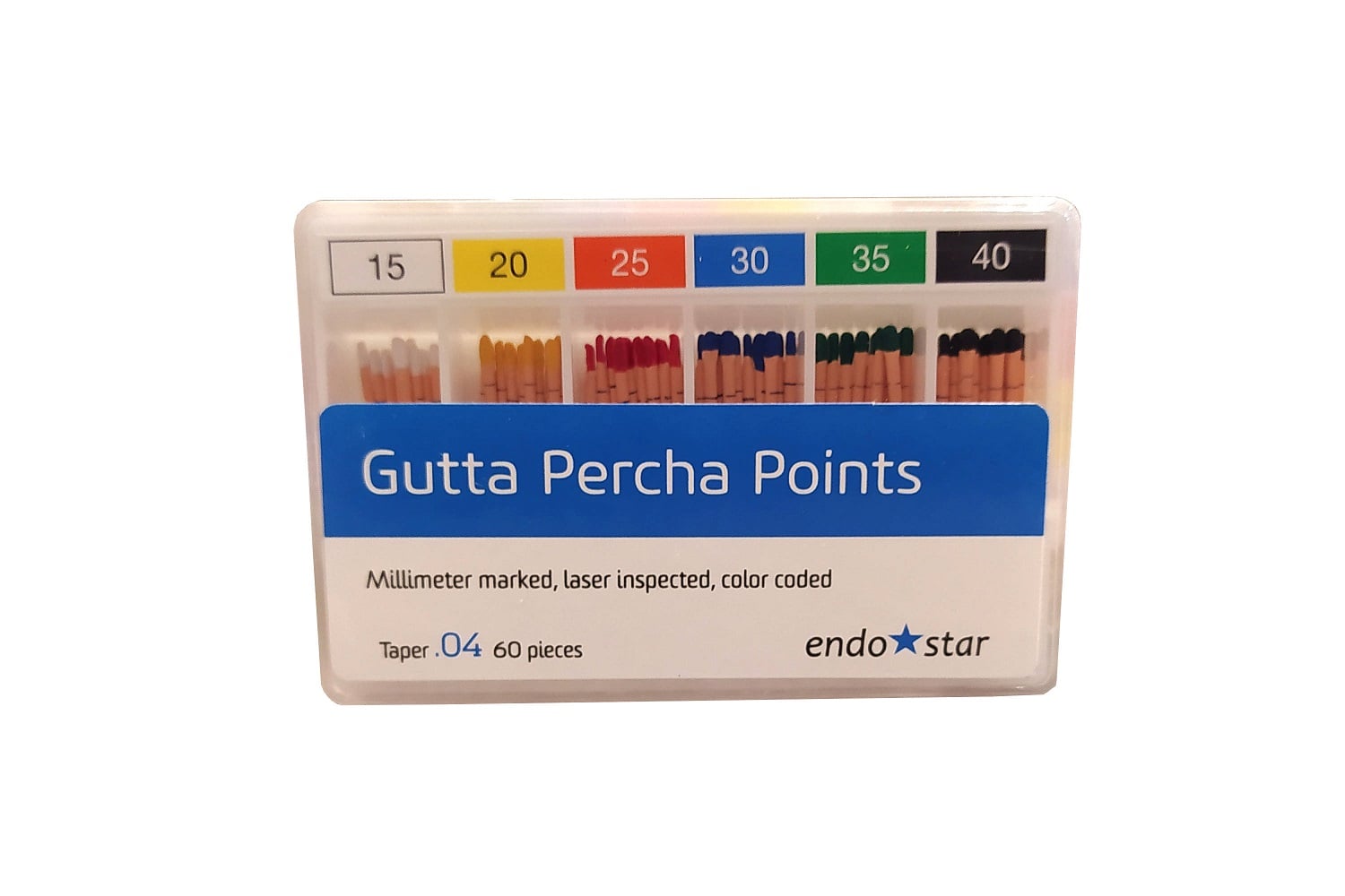 Kalibrowane sztyfty gutta-perkowe do uszczelniania kanałów. rozszerzenie 0.4 opakowanie: 60 sztuk, asortyment 45-80