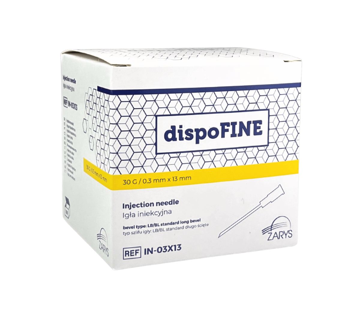 ZARYS dispoFine to wysokiej jakości igły iniekcyjne jednorazowego użytku, przeznaczone do precyzyjnego podawania leków w różnych procedurach medycznych i stomatologicznych. Wersja o wymiarach 0,30 x 13 mm (średnica x długość) zapewnia minimalną traumatyzację tkanek, co przekłada się na większy komfort pacjenta. Cechy : Rozmiar: 0,30 mm x 13 mm (30G x 1”) – idealne do precyzyjnych iniekcji podskórnych i śródskórnych. Cienkościenna konstrukcja – zapewnia większy przepływ przy cieńszej igle. Trójpłaszczyznowo ostrzona końcówka – ułatwia atraumatyczne wkłucie i zmniejsza dolegliwości bólowe. Uniwersalne złącze typu Luer – kompatybilne ze wszystkimi standardowymi strzykawkami. Sterylne, nietoksyczne i apirogenne – każda igła pakowana indywidualnie. Produkt jednorazowego użytku – zapewnia bezpieczeństwo i higienę pracy. Zastosowanie : Iniekcje podskórne, śródskórne i domięśniowe. Zastosowanie w stomatologii, medycynie, kosmetologii i weterynarii.