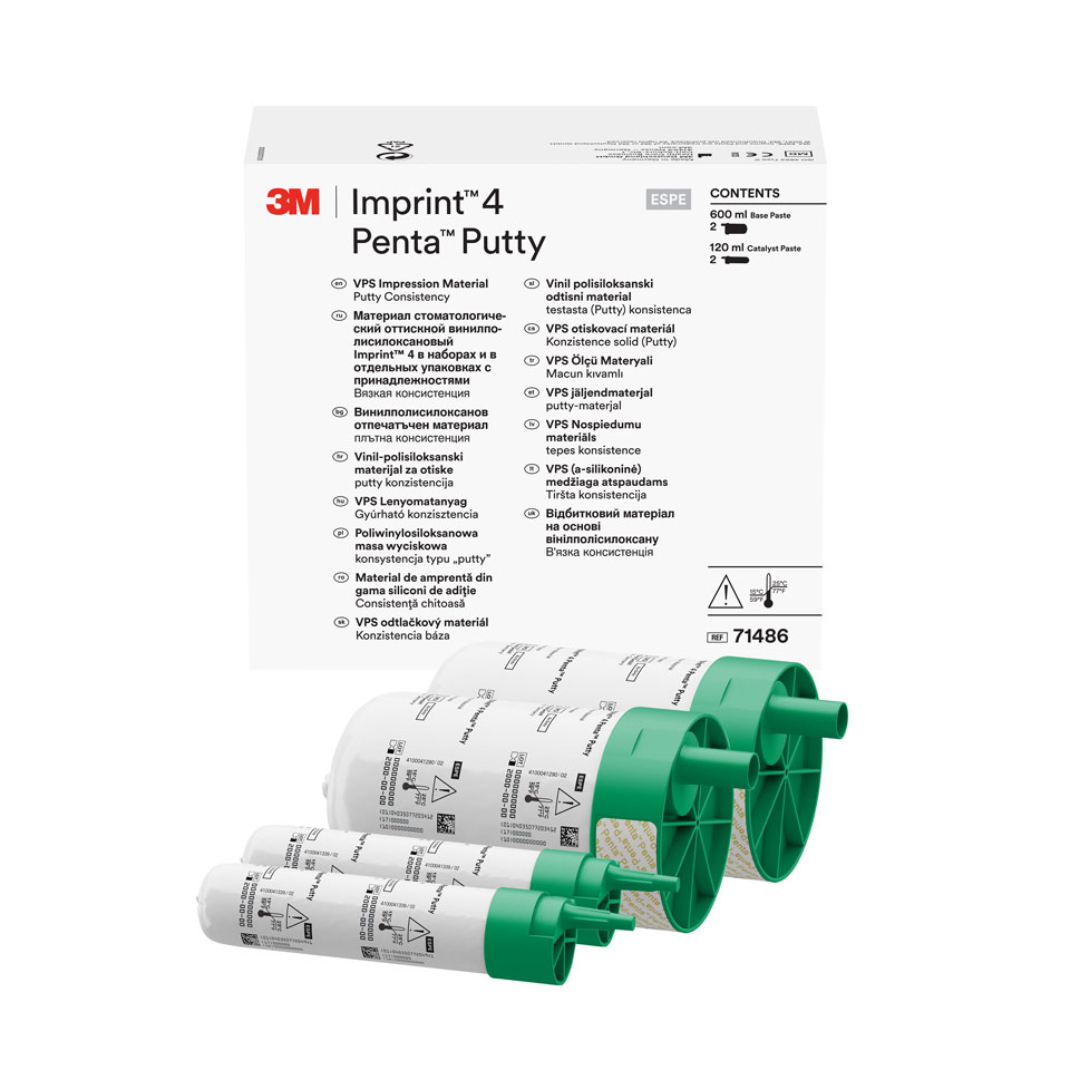 Imprint 4 to precyzyjna, hydrofilowa A-silikonowa masa do pobierania wycisków metodą jednoczasową-jednowarstwową i jednoczasową-dwuwarstwową. Masa wyciskowa Imprint 4 to materiał z najkrótszym dostępnym na rynku czasem pracy w jamie ustnej pacjenta. Materiał ten to połączenie pełnej kontroli, precyzji i szybkości pracy. Właściwości masy pozwalają na pobranie doskonałego precyzyjnego wycisku już za pierwszym razem. Imprint 4 zapewnia wystarczająco długi czas na przygotowanie masy i krótki czas wiązania. Wykorzystując specjalną chemię zawartą w materiale czas wiązania nie rozpoczyna się do momentu rozpoczęcia pracy w jamie ustnej pacjenta. Imprint 4 jest materiałem super-hydrofilowym co oznacza, że idealnie zapływa w trudno dostępne miejsca nawet w wilgotnym środowisku. Ta cecha umożliwia odtworzenie najdokładniejszych szczegółów, zapewniając najwyższą precyzję i ostrokonturowość pobranego wycisku. Wskazania: - Wyciski pod implanty. - Wyciski pod inlay’e i onlay’e. - Wyciski pod korony i mosty. Opakowanie: - 2x pasta bazowa każda po 300 ml, Putty (I warstwa); - 2x pasta katalizatora każda po 60 ml. *do automatycznego mieszania w mieszalniku 3M Pentamix.