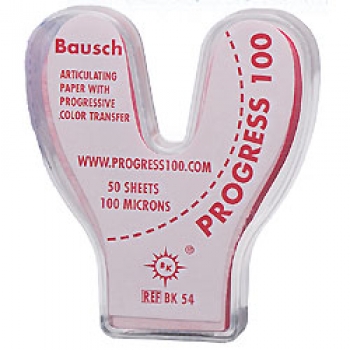 Bausch Progress 100µ- cienka elastyczna kalka wzmocniona włóknem z wysoką zawartością farby. Jest zaimpregnowana hydrofilowym woskiem i olejami farmaceutycznymi. Dzięki progresywnym odcieniom zaznacza precyzyjnie okluzyjne punkty kontaktu lub punkty kontaktu w okluzji centralnej. Dopasowuje się dokładnie do powierzchni zgryzu. Niepowtarzalna kombinacja z środkiem zwiększającym przyczepność Transculase umożliwia kontrolę także trudnych kontaktów na: - metalach polerowanych na wysoki połysk, - ceramice wypalanej na wysoki połysk lub wilgotnych powierzchniach. Kalka pakowana jest w plastikową kasetę-podajnik. opakowanie: 50 arkuszy kalki czerwonej w kształcie podkowy (do pełnego łuku)