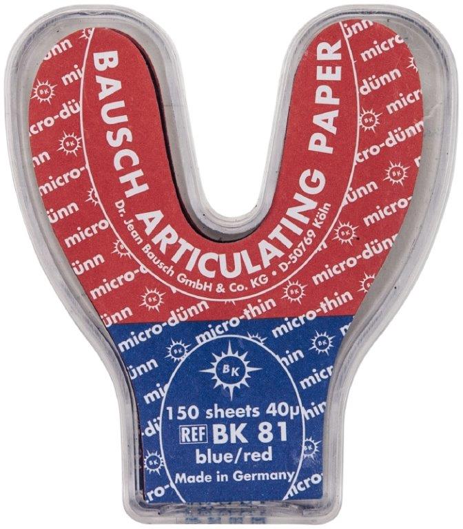 Arti-Check - super cienka i wytrzymała na zerwanie dwustronna kalka artykulacyjna 40µ Niezwykle precyzyjnie odtwarza punkty kontaktowe dzięki niewielkiej grubości materiału. Pozwala to uniknąć powstawaniu wadliwych i rozmazanych punktów kontaktowych. Specjalna warstwa ciekłego barwnika stanowi wiele małych mikrokapsułek, które nasączone są barwnikiem. Już pod naciskiem niewielkich sił żucia mikrokapsułki pękają i barwnik osadza się wyraźnie na kontrolowanych powierzchniach. Możliwe jest kilkakrotne użycie, ponieważ barwnik się regeneruje. Bardzo dobrze odznacza się na wilgotnych powierzchniach. Kalka w kształcie podkowy przeznaczona jest do kontroli okluzji w protezach całkowitych. Pozwala na obustronne zrównoważenie okluzji. Sprawdza się również przy dopasowywaniu szyn zgryzowych. opakowanie: 150 arkuszy w kształcie podkowy, niebiesko-czerwonych