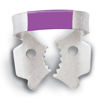 Klamra ze skrzydełkami do koferdamu. Posiada ząbki przy szczękach. Zapewnia dodatkową retrakcję koferdamu. Należy ją najpierw umieścić w otworze koferdamu, a następnie wraz z płatem gumowym umieścić na zębie. Oznaczenie kolorami ułatwia identyfikację. Matowe wykończenie nie powoduje odbić i zapewnia lepszą widoczność opakowanie: klamra do żuchwowych lewych i szczękowych prawych zębów trzonowych różowy pasek