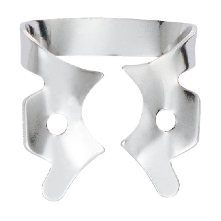 Klamra ze skrzydełkami do koferdamu, błyszcząca. Posiada ząbki przy szczękach. Zapewnia dodatkową retrakcję koferdamu. Należy ją najpierw umieścić w otworze koferdamu, a następnie wraz z płatem gumowym umieścić na zębie. opakowanie: klamra do częściowo wyrżniętych lub średnich trzonowców. 1 sztuka