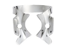 Klamra ze skrzydełkami do koferdamu, błyszcząca. Posiada ząbki przy szczękach. Zapewnia dodatkową retrakcję koferdamu. Należy ją najpierw umieścić w otworze koferdamu, a następnie wraz z płatem gumowym umieścić na zębie. opakowanie: klamra do częściowo wyrżniętych lub dużych trzonowców. 1 sztuka