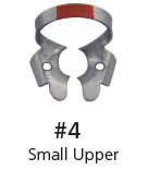 Klamra ze skrzydełkami do koferdamu. Posiada ząbki przy szczękach. Zapewnia dodatkową retrakcję koferdamu. Należy ją najpierw umieścić w otworze koferdamu, a następnie wraz z płatem gumowym umieścić na zębie. Oznaczenie kolorami ułatwia identyfikację. Matowe wykończenie nie powoduje odbić i zapewnia lepszą widoczność opakowanie: klamra do małych górnych zębów trzonowych, pomarańczowy pasek