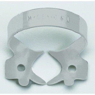 Klamra ze skrzydełkami do koferdamu, błyszcząca. Posiada ząbki przy szczękach. Zapewnia dodatkową retrakcję koferdamu. Należy ją najpierw umieścić w otworze koferdamu, a następnie wraz z płatem gumowym umieścić na zębie. opakowanie: klamra do częściowo wyrżniętych lub małych trzonowców. 1 sztuka