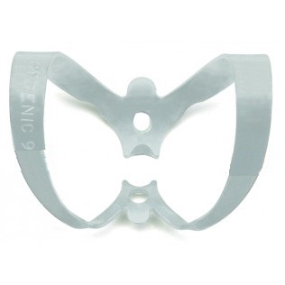 Klamra ze skrzydełkami do koferdamu, błyszcząca. Posiada ząbki przy szczękach. Zapewnia dodatkową retrakcję koferdamu. Należy ją najpierw umieścić w otworze koferdamu, a następnie wraz z płatem gumowym umieścić na zębie. opakowanie: uniwersalna dwułukowa klamra do zębów przednich. 1 sztuka