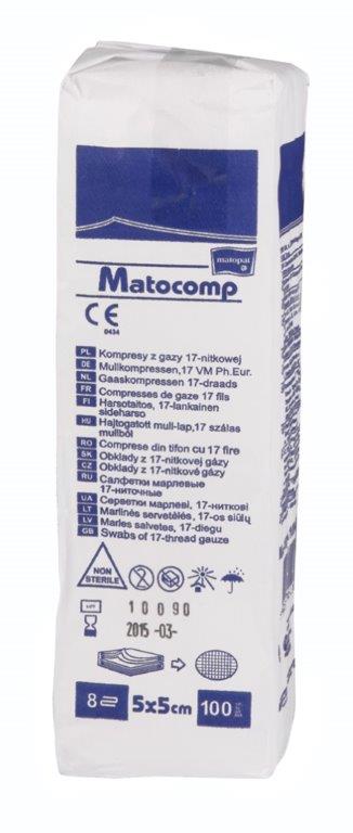 Matocomp - kompresy z gazy opatrunkowej, niejałowe. Stosowane do - pochłaniania płynów w trakcie zabiegów ambulatoryjnych i operacyjnych w przypadku ich jałowości, - celów higieniczno-kosmetycznych w przypadku ich wyjałowienia. Wykonane ze 100%, wysoce chłonnej gazy bawełnianej, bielonej metodą bezchlorową, która gwarantuje wysoki poziom czystości chemicznej. Zapewniają dużą zdolność wchłaniania wilgoci i płynów, są wydajne i ekonomiczne. Są miękkie i komfortowe dla pacjenta - znakomicie układają się na skórze i przylegają do rany. Bardzo dobrze przepuszczają powietrze - nie zakłócają naturalnych funkcji skóry. Pozbawione luźnych włókien na powierzchni kompresu, dzięki czemu podwyższone zostaje bezpieczeństwo użytkowania. Zabezpieczone w sposób uniemożliwiający wyprucie luźnej nitki kompresu. Można je poddawać sterylizacji parowej lub gazowej opakowanie papierowo-foliowe (torebka): 100 kompresów 17-nitkowych, 8-warstwowych wymiary 5cm x5cm Kompresy z gazy opatrunkowej są wyrobem jednorazowym. Podczas procedur inwazyjnych należy je stosować jedynie w stanie nierozwiniętym.
