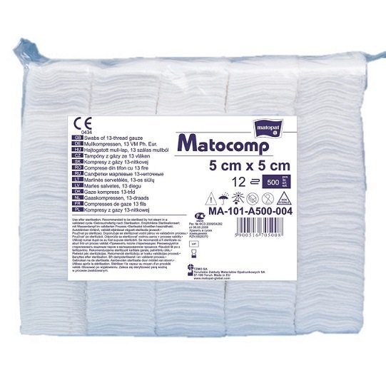 Matocomp - kompresy z gazy opatrunkowej, niejałowe. Stosowane do - pochłaniania płynów w trakcie zabiegów ambulatoryjnych i operacyjnych w przypadku ich jałowości, - celów higieniczno-kosmetycznych w przypadku ich wyjałowienia. Wykonane ze 100%, wysoce chłonnej gazy bawełnianej, bielonej metodą bezchlorową, która gwarantuje wysoki poziom czystości chemicznej. Zapewniają dużą zdolność wchłaniania wilgoci i płynów, są wydajne i ekonomiczne. Są miękkie i komfortowe dla pacjenta - znakomicie układają się na skórze i przylegają do rany. Bardzo dobrze przepuszczają powietrze - nie zakłócają naturalnych funkcji skóry. Pozbawione luźnych włókien na powierzchni kompresu, dzięki czemu podwyższone zostaje bezpieczeństwo użytkowania. Zabezpieczone w sposób uniemożliwiający wyprucie luźnej nitki kompresu. Można je poddawać sterylizacji parowej lub gazowej opakowanie foliowe (torebka): 500 kompresów 13-nitkowych, 12-warstwowych wymiary 5cm x5cm Kompresy z gazy opatrunkowej są wyrobem jednorazowym. Podczas procedur inwazyjnych należy je stosować jedynie w stanie nierozwiniętym