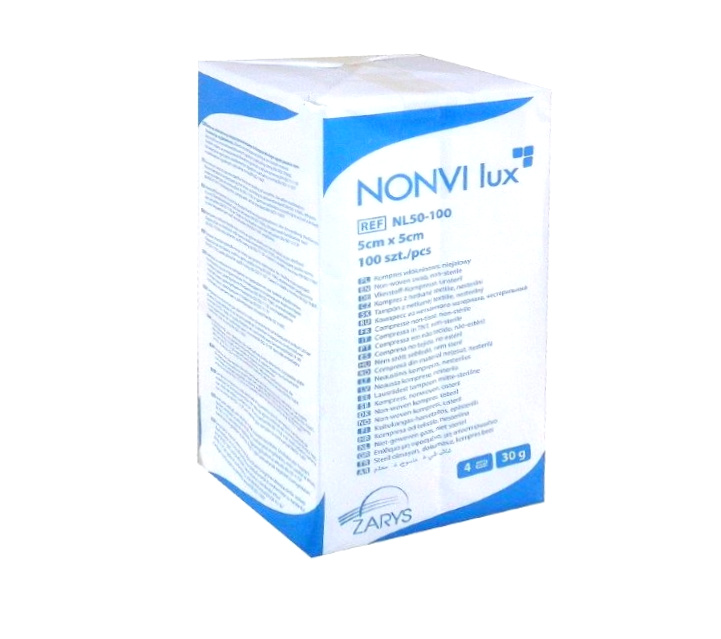 NONVI lux - niejałowy kompres do ogólnego zaopatrywania ran. Wykonany z hydrofilowej, 4-warstwowej włókniny medycznej o gramaturze 30g/m2. Ścisłe tkanie zwiększa jego wytrzymałość i zapobiega strzępieniu się nitek. Jest miękki i komfortowy, bardzo dobrze układa się na powierzchni. Może być poddawany sterylizacji radiacyjnej oraz z zastosowaniem pary wodnej lub tlenku etylenu. Po wyjałowieniu znajduje ogólne zastosowanie w ambulatoriach, gabinetach lekarskich, na blokach operacyjnych oraz oddziałach zabiegowych. opakowanie: 100 kompresów w papierowej torebce, wymiary 5x5cm. karton zbiorczy zawiera 50 opakowań podstawowych