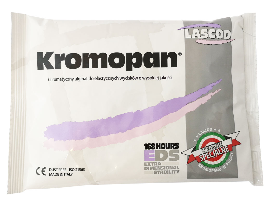 Masa alginatowa klasy A z chromatycznym wskaźnikiem fazy. Przeznaczona jest do elastycznych i precyzyjnych wycisków. Znajduje zastosowanie we wszystkich dziedzinach stomatologii. Użycie chromatycznego wskaźnika ułatwia ocenę fazy pracy: - mieszania (kolor fioletowy), - nakładania na łyżkę i do jamy ustnej (kolor różowy), - wiązania (kolor biały -1,5 do 2 minut) Po związaniu masy pobrany wycisk zachowuje niezmienne kształty i parametry do 120 godzin. opakowanie: 450g