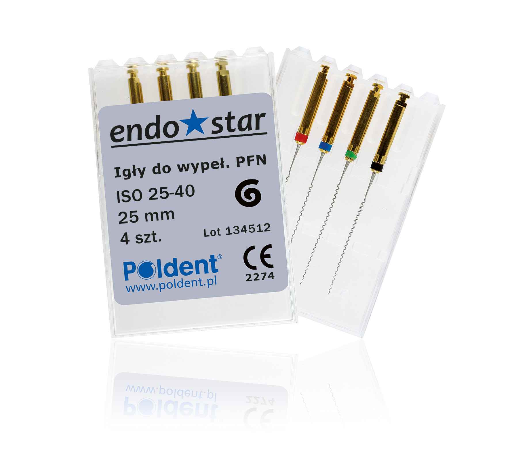 Endostar Igły do wypełniania kanałów bez sprężynki Maszynowe igły bez sprężynki do wypełniania kanałów pastami i cementami Igły do wypełniania kanału bez sprężynki (PFN), zwane także igłami Lentulo, to instrumenty przeznaczone do wypełniania kanałów materiałami o półpłynnej konsystencji (pastami i cementami). Ich część pracująca ma kształt wydłużonego stożka i tworzy ją luźno zwinięta spirala z cienkiego drutu. - złoty kolor uchwytów pozwala na szybkie odróżnienie igieł od innych instrumentów, - wprowadzanie materiału odbywa się tylko przy wykonywaniu ruchów w prawo (zgodnie z ruchem wskazówek zegara), - dopuszczalna prędkość obrotowa kątnicy: poniżej 800obr./min, - przekrój poprzeczny Sterylizacja Wyroby niesterylne. Należy je wysterylizować przed użyciem. Instrumenty mogą być wielokrotnie sterylizowane w autoklawie parowym w temperaturze 134°C. Zalecany czas sterylizacji: 3 minuty przy nadciśnieniu 2,1 bar. Instrumenty mogą być dezynfekowane w łagodnych środkach dezynfekcyjnych oraz myte w myjkach ultradźwiękowych. opakowanie: 4 igły Lentulo bez sprężynki, o długości 25mm, w asortymencie 25-40