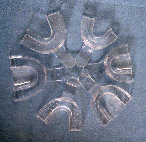 Perforowane łyżki do wycisków. Wykonane z (nieodpornego na wysoką temperaturę) tworzywa sztucznego. Przeznaczone wyłącznie do jednorazowego użytku. Opakowanie: 20 łyżek dolnych w rozmiarze 1 (małe)