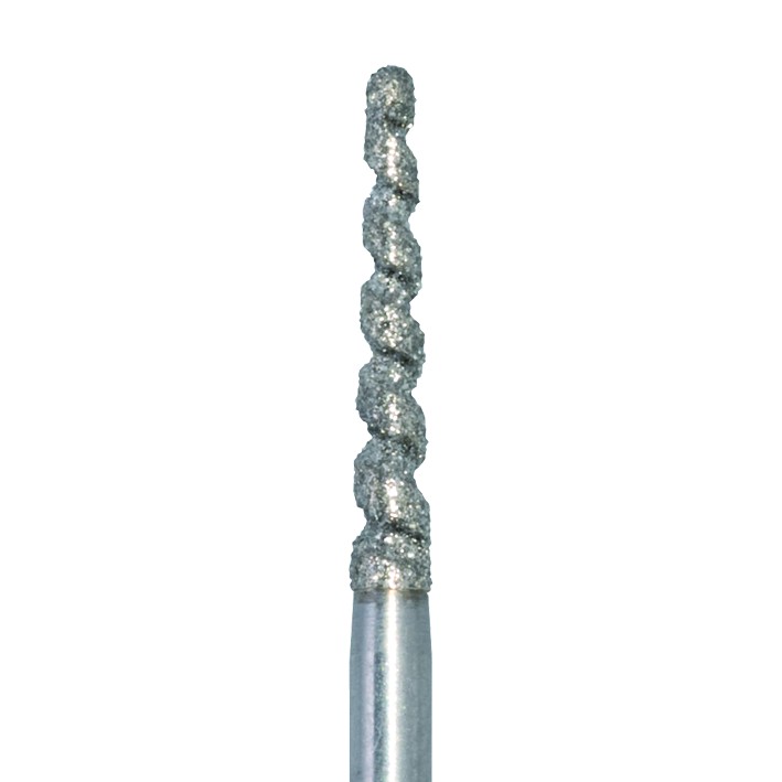 Spiralne wiertło z nasypem diamentowym na turbinę, stożek długi z zaokrąglonym wierzchołkiem. Zapewnia optymalną wydajność szlifowania bez zapychania wiertła opiłkami zębiny. Szczeliny w spirali ułatwiają przepływ wody ze sprayu i zapobiegają przegrzaniu tkanek. nasyp standardowy, rozmiar 016