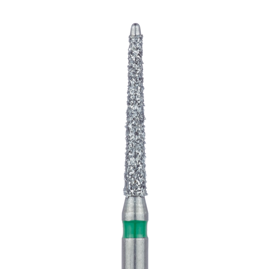 Wiertło diamentowe na turbinę, wąski długi stożek z zaokrąglonym gładkim wierzchołkiem /bez nasypu/ do opracowania ścian komory zęba lub okolicy przyszyjkowej zęba nasyp zgrubny /zielony pasek/ rozmiar 014