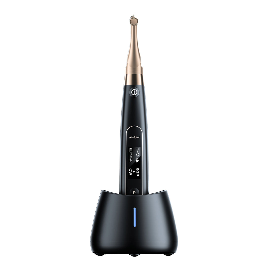 Mikrosilnik endodontyczny Woodpecker Ai-Motor z endometrem Woodpecker Ai-Motor to nowoczesny, bezprzewodowy mikrosilnik endodontyczny z wbudowanym endometrem (apex locator), zaprojektowany do precyzyjnego opracowywania kanałów korzeniowych z jednoczesną kontrolą długości roboczej. Urządzenie wykorzystuje zaawansowany silnik bezszczotkowy, który oferuje około 10-krotnie dłuższą żywotność niż tradycyjne silniki szczotkowe, zapewniając stabilny moment obrotowy i wydajne cięcie nawet w wąskich i zakrzywionych kanałach. Kompaktowa konstrukcja z głowicą obrotową w pełnym zakresie 360° oraz przesuniętym do przodu środkiem ciężkości gwarantuje doskonałą ergonomię i łatwiejszy dostęp do zębów w odcinkach bocznych. Zalety mikrosilnika Ai-Motor Woodpecker Bezpieczne omijanie stopni (T-Mode): Innowacyjny tryb łączący ruch wahadłowy (90°) do osiągnięcia przeszkody oraz posuwisto-zwrotny (180° CW / 90° CCW) po ominięciu stopnia. Trwałość i precyzja: Bezszczotkowy endomotor gwarantuje płynną pracę, niski poziom hałasu oraz wysoką odporność na obciążenia podczas leczenia kanałowego. Zintegrowany lokalizator wierzchołka: Trzy inteligentne programy współpracy (Auto Start/Stop, Auto Slow-Down, Auto Reverse) minimalizują ryzyko perforacji wierzchołkowej. Wyjątkowa ergonomia: Mini kątnica 6:1 o zredukowanej wysokości główki ułatwia widoczność pola zabiegowego. Pełna mobilność: Brak kabli oraz bezprzewodowe ładowanie indukcyjne zwiększają komfort użytkowania w gabinecie stomatologicznym. Wydajne zasilanie: Pojemna bateria 2000 mAh pozwala na przeprowadzenie wielu zabiegów na jednym ładowaniu. Kluczowe cechy i funkcjonalność Profil zastosowania: Zaawansowana endodoncja – opracowywanie kanałów z pomiarem impedancji w czasie rzeczywistym. Zaawansowany tryb T-Mode: Specjalistyczny algorytm (Ledge Bypassing) ułatwiający pokonywanie trudnych przeszkód anatomicznych. Intuicyjne funkcje automatyczne: Automatyczna redukcja prędkości w wąskich kanałach oraz natychmiastowe zatrzymanie ruchu po osiągnięciu wierzchołka. Szeroka kompatybilność: Fabryczna baza programów dla najpopularniejszych systemów pilników (m.in. Protaper Gold, WaveOne Gold, Reciproc Blue) oraz możliwość konfiguracji własnych ustawień. Higiena i bezpieczeństwo: Kątnica przystosowana do wielokrotnej sterylizacji w autoklawie w temperaturze 134°C. Informacje techniczne i specyfikacja Model: Ai-Motor (dostępny w wersji Black / White). Prędkość obrotowa: Regulowana w zakresie 100 – 500 RPM (maksymalnie do 2500 RPM w trybach specjalistycznych). Moment obrotowy (Torque): 2,0 – 5,0 Ncm (zakres operacyjny silnika od 0,4 Ncm). Zasilanie: Wydajny akumulator litowo-jonowy 2000 mAh. Ładowanie: System bezprzewodowy (indukcyjny). Kątnica stomatologiczna: Przełożenie 6:1, główka typu mini, pełny obrót 360 stopni. Technologia: Silnik bezszczotkowy (Brushless) + zintegrowany Apex Locator.