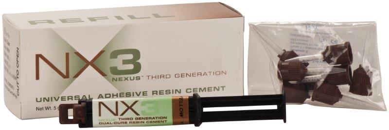 NX3 - uniwersalny, dualnie wiążący cement adhezyjny na bazie żywic. Przeznaczony jest do stałego osadzania wszelkiego rodzaju uzupełnień protetycznych, łącznie z licówkami i mostami adhezyjnymi. Dzięki innowacyjnej budowie chemicznej wykazuje doskonałą adhezję do zębiny, szkliwa, bloczków CAD/CAM, ceramiki, porcelany, kompozytów i metalu. Może być stosowany z systemami łączącymi (np. OptiBond XTR), w technice self-etch lub total-etch. Jest szybki i prosty w użyciu, a żelowa faza ułatwia usunięcie nadmiarów bez zanieczyszczenia uzupełnień. Strzykawkowe opakowanie Automix eliminuje konieczność ręcznego mieszania. Końcówki mieszające zapewniają uzyskanie jednorodnej mieszaniny we właściwych proporcjach. Materiał dostępny jest w 5 odcieniach, przez co umożliwia zachowanie estetyki w jamie ustnej. Zoptymalizowana matryca oraz wolny od amin trzeciorzędowych inicjator reakcji polimeryzacji chemicznej zapewniają długotrwałą stabilność koloru. Wskazania: ostateczne osadzanie wszelkiego rodzaju prac protetycznych takich jak: - korony i mosty, - wkłady i nakłady (inlay/onlay), - licówki, - wkłady koronowo-korzeniowe. uzupełnienie: 1 strzykawka typu Automix 5g, odcień Yellow