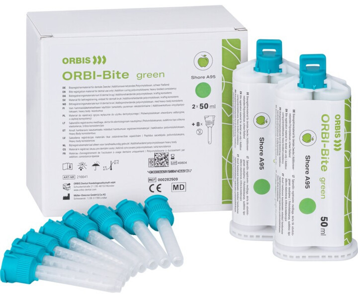 Materiał na bazie silikonów A do rejestracji zwarcia. Posiada właściwości tiksotropowe, zapewnia wysoką precyzję odwzorowania. Jest łatwy i bezpieczny w użyciu. Mieszające końcówki ułatwiają uzyskanie jednorodnej masy oraz bezpośrednią aplikację. Wymaga użycia pistoletu. opakowanie: 2x50ml + 8 końcówek kolor zielony, smak jabłkowy czas pracy: 30 sekund, czas wiązania: 45 sekund twardośc końcowa: Shore A95