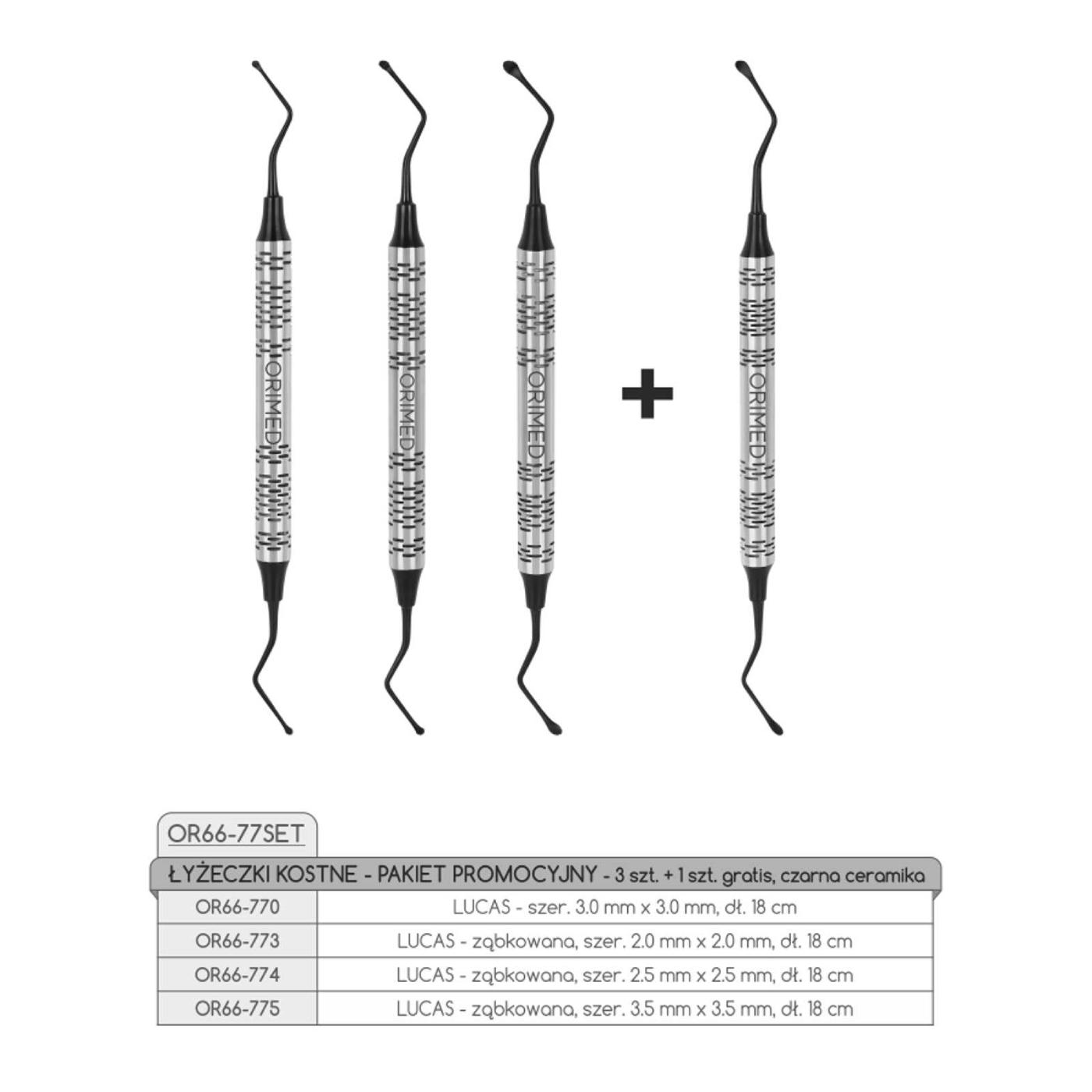 Zestaw łyżeczek kostnych typu Lucas z powłoką ceramiczną, zwiększającą odporność narzędzi na ścieranie i ułatwiającą utrzymanie sterylności. Doskonałe do oczyszczania zębodołów oraz usuwania tkanek ziarninowych. Zawartość zestawu: OR66-770 LUCAS – szer. 3,0 mm x 3,0 mm, dł. 18 cm OR66-773 LUCAS ząbkowana – szer. 2,0 mm x 2,0 mm, dł. 18 cm OR66-774 LUCAS ząbkowana – szer. 2,5 mm x 2,5 mm, dł. 18 cm OR66-775 LUCAS ząbkowana – szer. 3,5 mm x 3,5 mm, dł. 18 cm (gratis)