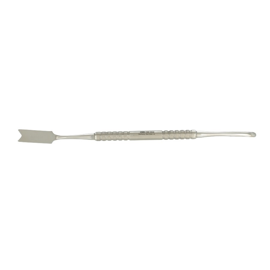 Łopatka do przytrzymywania płata śluzówki + raspator ostry. Wymiary: łopatka: szer. 11 mm, dł. 33 mm raspator: szer. 5 mm