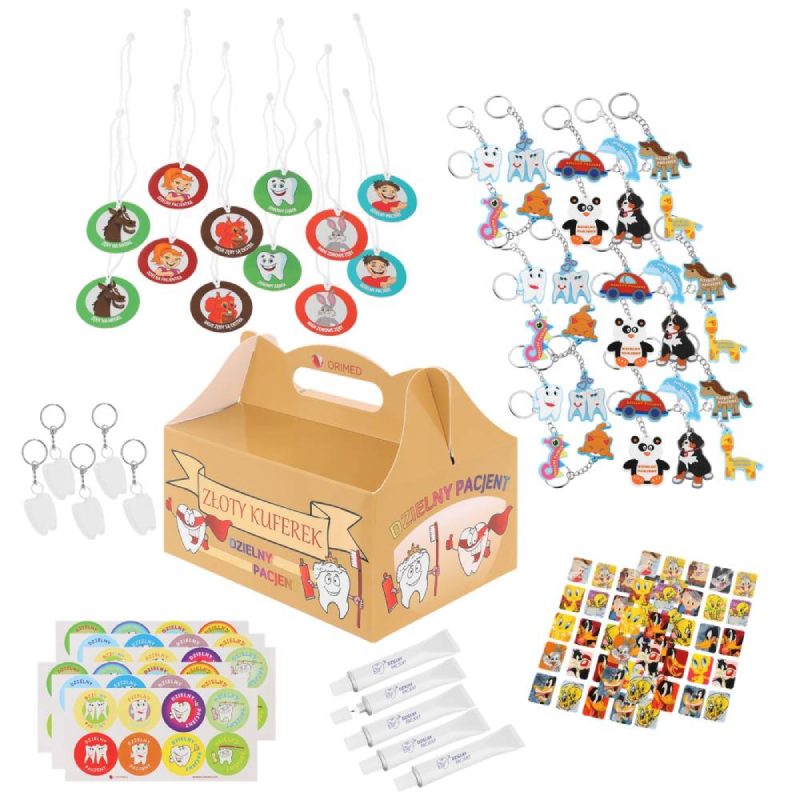Kuferek z nagrodami dla najmłodszych pacjentów. opakowanie: 150 sztuk w asortymencie medale, naklejki, breloczki, ołówki i długopisy