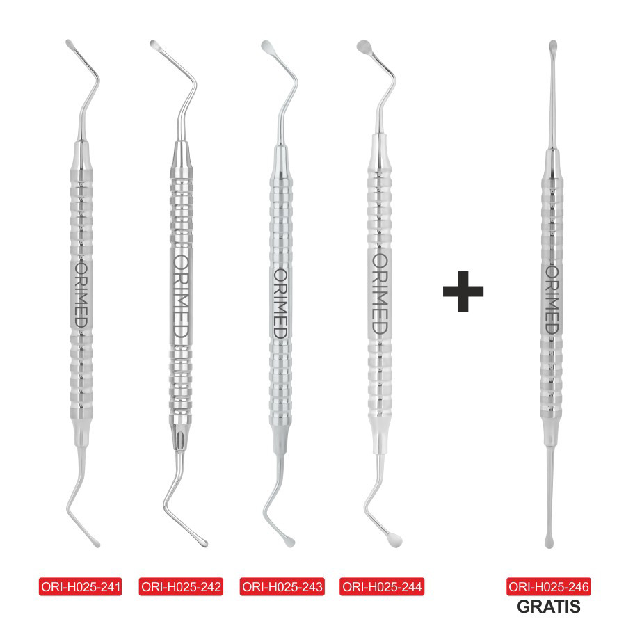 Pakiet promocyjny ORI-H025-5SET zawiera pięć wysokiej jakości łyżeczek kostnych z ergonomicznym uchwytem typu „S-Ergo”, zapewniającym wygodę pracy. Wykonane są ze stali chirurgicznej odpornej na korozję, przeznaczone do usuwania patologicznych tkanek oraz łyżeczkowania kości w zabiegach weterynaryjnych i stomatologicznych. Zestaw składa się z czterech narzędzi oraz jednego dodatkowego, gratisowego instrumentu, umożliwiając dobór odpowiedniego rozmiaru do konkretnego zabiegu.