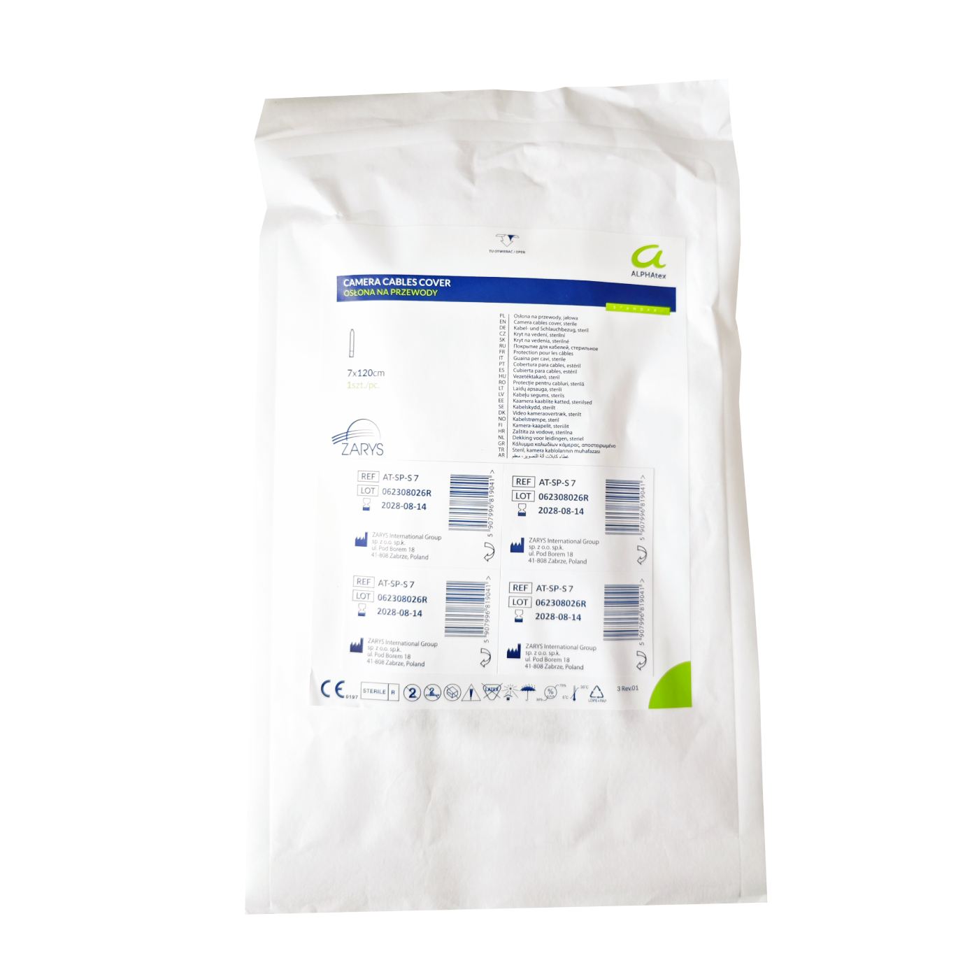 Sterylna osłona na przewody. Wymiary: 7 x 120 cm Opakowanie zawiera 4 naklejki TAG dołączone do karty pacjenta z informacją o dacie ostatniego użycia i numerze serii.