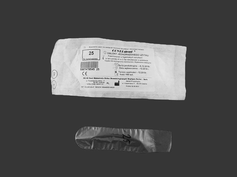 Jednorazowe osłonki powierzchniowe do urządzeń stomatologicznych. Wykonane z przezroczystej, termokurczliwej folii. Stanowią dodatkową ochronę przed zakażeniami krzyżowymi wirusami (w tym HIV, HBV i HCV) lub innymi chorobami zakaźnymi. Sterylizowane promieniami jonizującymi (nie nadają się do sterylizacji w autoklawie). opakowanie: 100 równoległych osłonek z zaokrąglonym wierzchołkiem typu 25 pasują do ustnika pamntomografu (zagryzaka) 3,2x8cm wymiary: długość całkowita 13,4cm x szerokość 3,3cm Końcowa część osłonki nie posiada spawu bocznego na odcinku ok. 4cm. Zaleca się ogrzewanie osłonek w celu ich obkurczenia (zawsze rozpoczynając od wierzchołka narzędzia (np. od główki końcówki). Zapewnia to lepsze dopasowanie do końcówki urządzenia i zapobiega zsuwaniu się osłonki i jej zanieczyszczeniu. Należy dobierać rozmiar oslonki z zapasem 1mm w celu swobodnego przepływu powietrza podczas obkurczania. W przeciwnym razie powstanie pęcherz powietrzny. Do obkurczania oslonek należy stosować nagrzewnice z dyszą odbiciową.