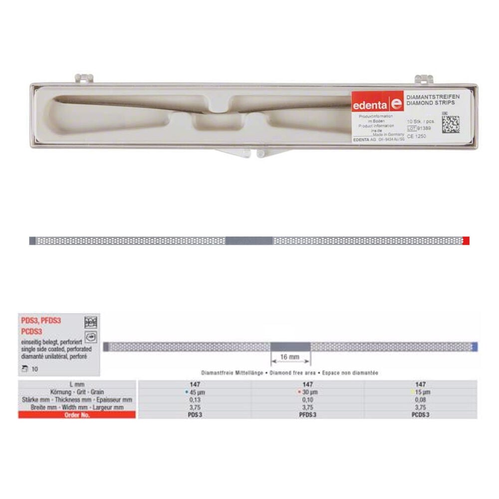 Paski diamentowe Edenta PFDS3 to cienkie metalowe paski z jednostronnym nasypem diamentowym, zaprojektowane głównie do opracowywania powierzchni przyległych (proksymalnych) w wypełnieniach. Umożliwiają precyzyjne wykończenia w strefach kontaktowych, korektę nadmiaru materiału i nadanie właściwego kształtu oraz gładkości powierzchni.