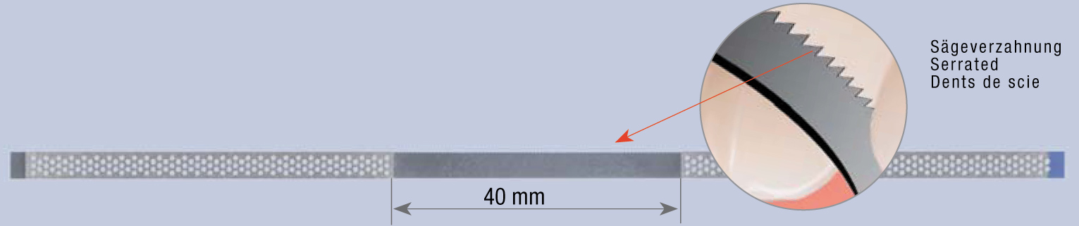 Specjalne paski metalowe z jednostronnym nasypem diamentowym do opracowania i polerowania. Perforowane po bokach oraz ząbkowane w środkowej, wolnej od nasypu, części (40mm) szerokość 3,75mm; długość 147mm, grubość 0,10mm nasyp delikatny /czerwony pasek/ 30 mikronów opakowanie: 10 sztuk