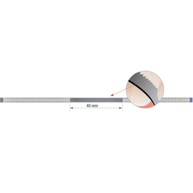 Specjalne paski metalowe z jednostronnym nasypem diamentowym do opracowania i polerowania. Perforowane po bokach oraz ząbkowane w środkowej, wolnej od nasypu, części (40mm) szerokość 3,75mm; długość 147mm, grubość 0,13mm nasyp standardowy /niebieski pasek/ 45 mikronów opakowanie: 10 sztuk