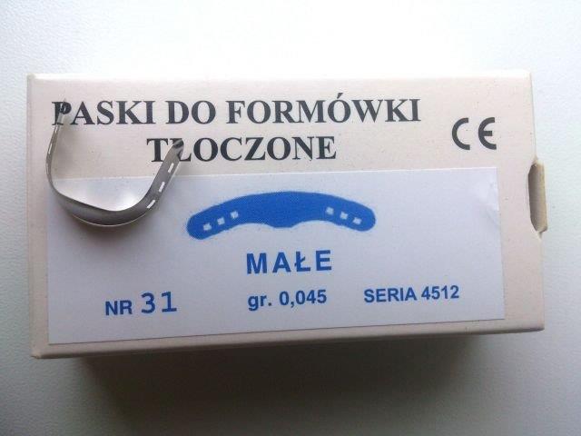 Jednościenne paseczki metalowe do zakładania wypełnień. Wytłoczony brzuszek w środkowej części paska ułatwia odbudowę z zachowaniem anatomicznego kształtu zęba. Paski są przeznaczone do formówek starego typu (Ivory), posiadają otwory na skrzydełkach do mocowania. opakowanie 30 paseczków ze średnim brzuszkiem grubośc paska: 0,045mm