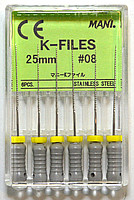 K-FILES – ręczne narzędzia ze stali nierdzewnej do opracowywania kanałów korzeniowych. ich część pracująca posiada ściśle skręconą spiralę z 4 krawędziami tnącymi. Są dość elastyczne - zapewniają bezpieczeństwo pracy. Można je lekko doginać do kształtu kanałów. Instrumentem tym wykonuje się ruchy dociskowo-wysuwające, a więc ruchy piłowania. Możliwe jest niewielkie obracanie narzędzia o 45°-90°. opakowanie: 6 pilników długości 25mm, rozmiar 008/szary