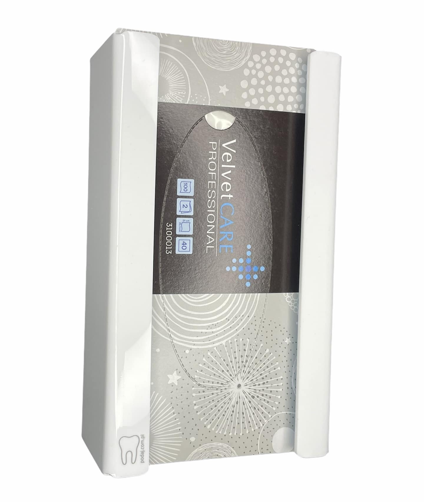 Podajnik na chusteczki / rękawiczki jednorazowe: - Łatwo mocowany do słupka unitu, ściany lub szafki. - Pasuje do większości unitów stomatologicznych na rynku. - Możliwość wielokrotnego odczepienia podajnika dzięki rzepowi 3M Dual Lock. - Podajnik mieści dwie wielkości opakowań chustek/rękawiczek jednorazowych, opakowania 100szt. i opakowania 150szt. - W zestawie opakowanie 100szt. chusteczek jednorazowych Velvet – GRATIS. - Rozmiar podajnika: 22,5 x 13 x 7 cm.
