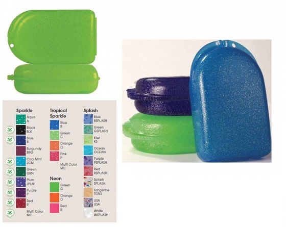 Pudełka na aparty ortodontyczne, podłużne. Wykonane z kolorowego tworzywa sztucznego. Zatrzask zapobiega otwieraniu się pudełka. Nadają się do aparatów blokowych.