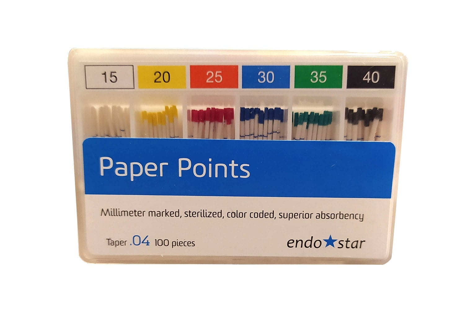 Kalibrowane sączki papierowe do osuszania kanałów korzeniowych. Bardzo dobrze pochłaniają wilgoć, nie tracą kształtu mimo wysokiego nasączenia. Posiadają podziałkę na wysokości 18-19-20-22-24 mm dla lepszej kontroli głębokości roboczej. Wstępna sterylizacja produktu zapewnia higieniczną pracę podczas użycia sztyftów w kanale. Kolorystyczne, zgodne z ISO oznaczenie główek sztyftów ułatwia szybką identyfikację rozmiaru. Kasetowe opakowanie umożliwia łatwe wyjmowanie i przechowywanie sztyftów. opakowanie: 100 sztuk, rozmiar 045 (białe) zbieżność .04