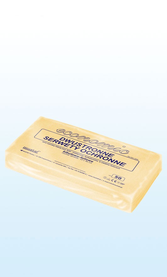 Jednorazowe, ochronne serwety dla pacjenta. Wykonane z podwójnej warstwy chłonnej bibuły przedzielonej zapobiegającą przemakaniu warstwą folii PE. Są odporne na rozerwanie, miłe w dotyku, ekonomiczne w użyciu Nie posiadają troczków do wiązania - mocowane na łańcuszek. Sposób złożenia serwet dopasowany jest do opakowania kartonowego z podajnikiem. uzupełnienie: 100 składanych serwet o wymiarach: 33 × 46 cm. kolor żółty karton zbiorczy zawiera 20 opakowań