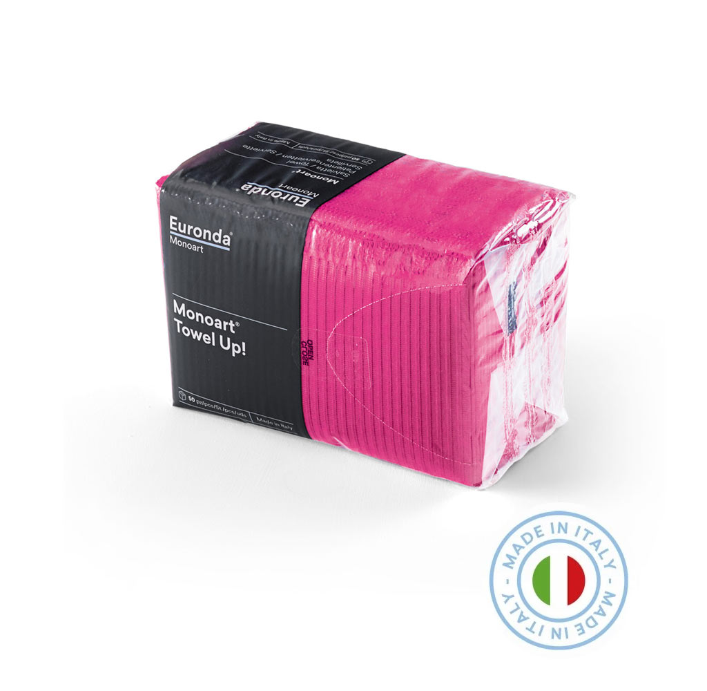 Monoart® Towel Up! - wysokiej jakości ochronne serwety dla pacjenta. Wykonane z czystej, wysoce chłonnej celulozy oraz zapobiegającej przemakaniu jednej warstwy folii PE. Zapewniają doskonałą ochronę dzięki poziomej wytłaczanej strukturze i wyjątkowej krawędzi odprowadzającej wodę. Nie posiadają troczków do wiązania - wymagają mocowania na łańcuszek. Przeznaczone do użytku jednorazowego. Wygodne opakowanie z innowacyjnym systemem wielokrotnego zamykania ułatwia szybkie pobieranie serwetki. opakowanie foliowane: 50 sztuk, kolor fuksja wymiary: 33x45 cm. karton zbiorczy zawiera 10 opakowań a 50 serwet
