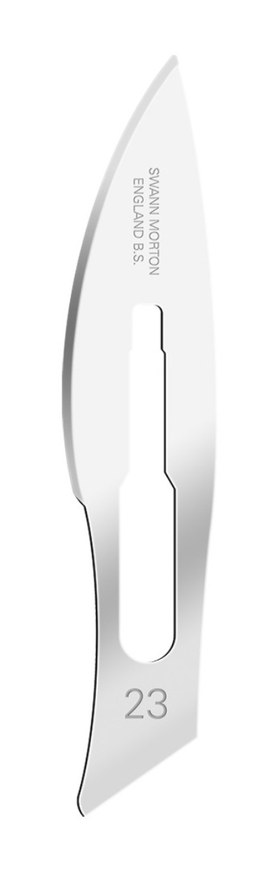 Sterylne ostrza skalpeli. Wykonane z wysoko gatunkowej stali nierdzewnej. Pakowane osobno. Przeznaczone do jednorazowego użytku. opakowanie: 100 ostrzy w rozmiarze 23 pasują do rękojeści: 4, 4L, 4 Grawerowane oraz 6B