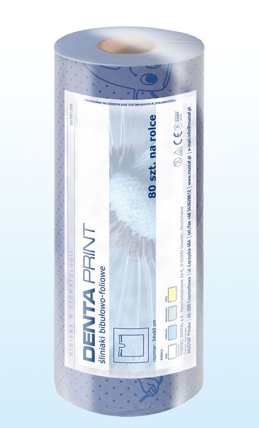 Ochronne, bibułowo-foliowe śliniaki dla pacjenta. Wykonane z chłonnej bibuły wzmacnianej zapobiegającą przemakaniu i zabrudzeniom folią PE. Posiadają troczki do wiązania na szyi oraz wycięcie pod szyję na krótszej krawędzi śliniaka. Przeznaczone do jednorazowego użytku. opakowanie: rolka 80 śliniaków o wymiarach 54x60 cm kolor: błękitny z niebieskim nadrukiem w ząbki karton zbiorczy zawiera 20 rolek